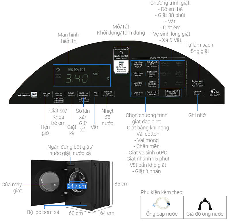 - Hỗ trợ công nghệ Inverter tiên tiến cho thiết bị vận hành ổn định, êm ái, nâng cao khả năng giặt tẩy đồng thời giúp tiết kiệm điện năng đáng kể cho gia đình.