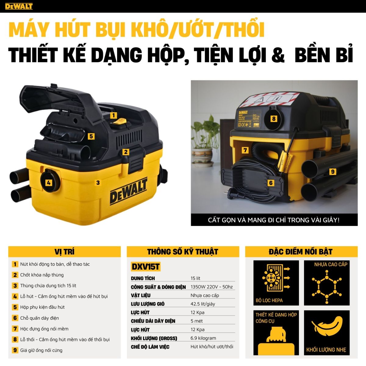Máy hút bụi 3 chức năng 15L DeWalt DXV15T