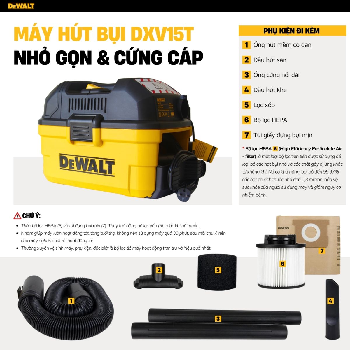 Đi kèm đầy đủ các phụ kiện cần thiết như: ống hút bụi, bàn hút sàn, bàn hút thảm, đầu hút khe, đầu hút nước bẩn,… đáp ứng mọi nhu cầu vệ sinh.