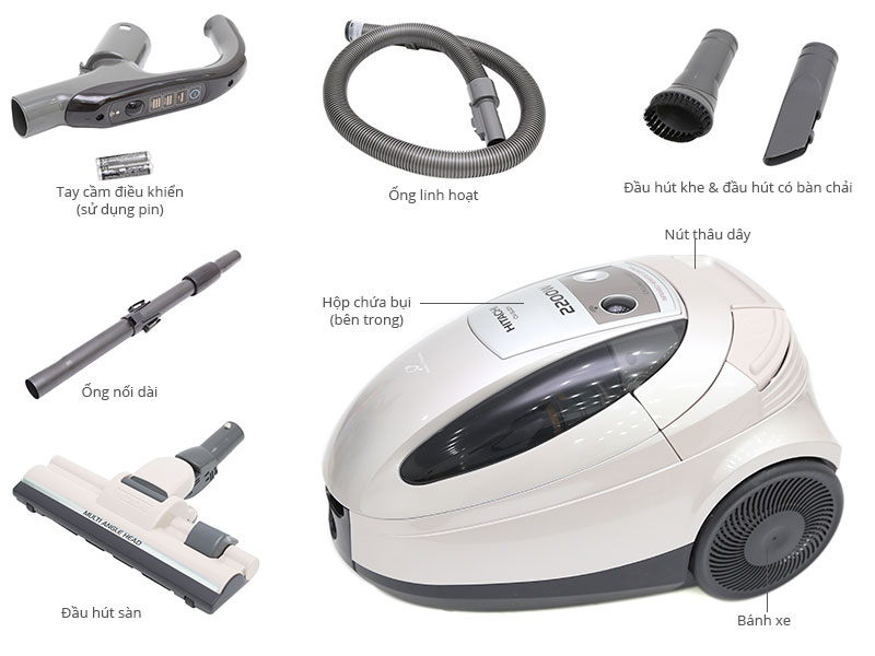 - Công nghệ hút xoáy Cyclonic với công suất 2200W hút sạch bụi bẩn, giúp giảm tối đa lượng bụi bẩn bám lại ở bộ lọc, tiết kiệm thời gian vệ sinh nhà cửa hiệu quả.