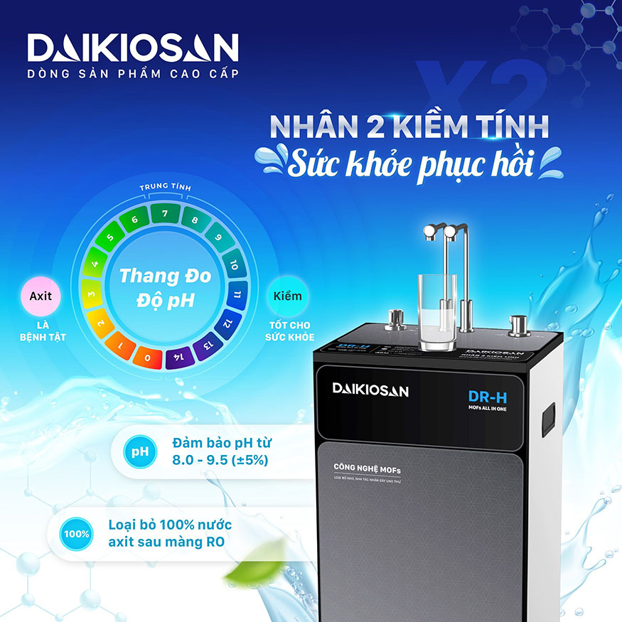 - Máy lọc nước nóng nguội lạnh Daikiosan DR H DN302 sử dụng hệ thống lọc tiên tiến với 11 cấp và 2 cấp nâng kiềm, đảm bảo rằng nước bạn uống luôn được cân bằng độ pH lý tưởng và chứa các ion kiềm quan trong cho sức khỏe. Hệ thống lọc này mang lại nhiều lợi ích cho sức khỏe.