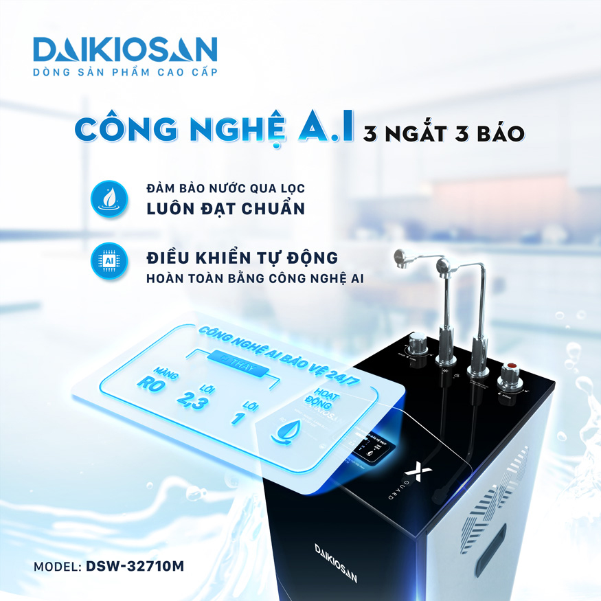+ Máy lọc nước X-Guard RO nóng nguội lạnh in 2D Daikiosan DSW-32710M với công nghệ AI bảo vệ gia đình bạn 24/24