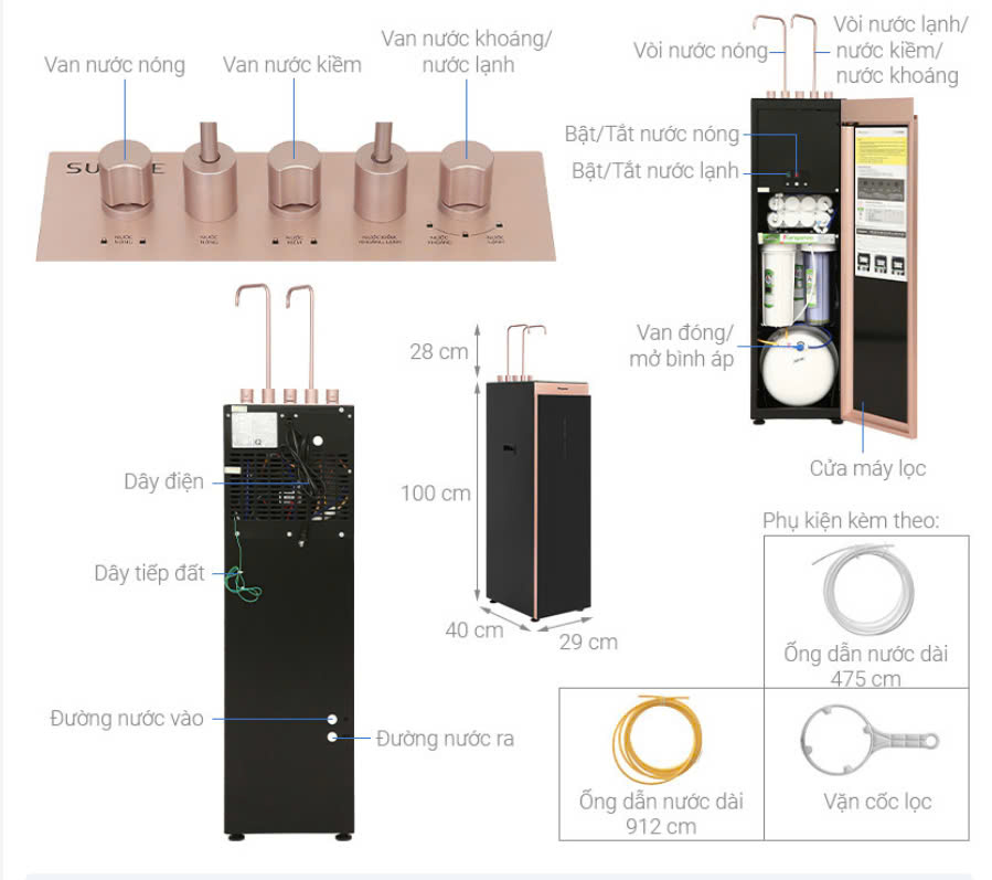 Dung tích bình chứa: RO: 7L – Nóng: 1L – Lạnh: 1L