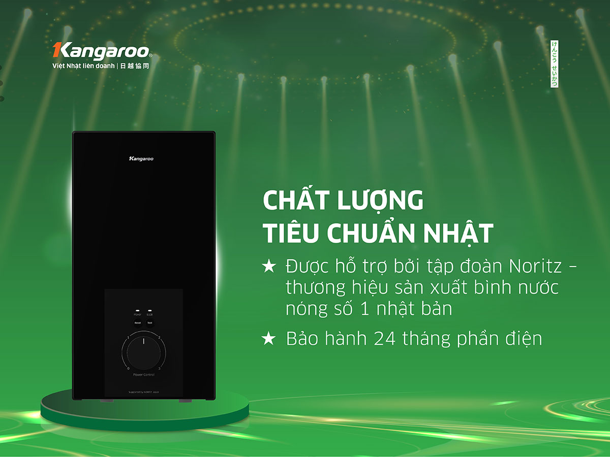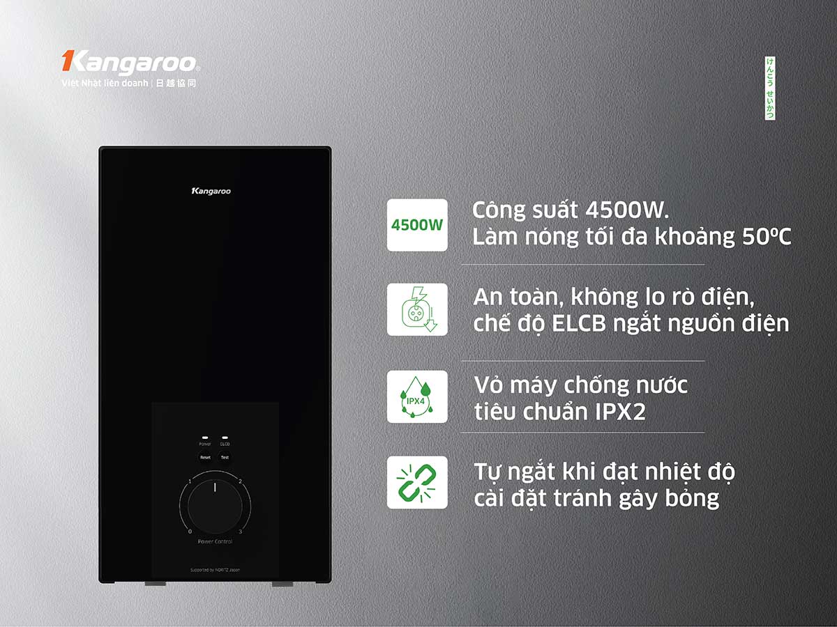 Bảo hành: 24 tháng Tính năng: Máy nước nóng trực tiếp Kangaroo KGWD45N2 với công nghệ làm nóng trực tiếp công suất lớn 4500W, Kangaroo KGWD45N2 cung cấp nước nóng tối đa lên đến 50℃ – không cần chờ đợi và không giới hạn lượng nước nóng mỗi lần sử dụng. Máy nước nóng trực tiếp Kangaroo KGWD45N2 có 3 mức điều chỉnh nhiệt độ nước đầu ra: Mức 1: 1700W – Mức 2: 2800W – Mức 3: 4500W. Máy nước nóng trực tiếp Kangaroo KGWD45N2 trang bị đèn hiển thị trạng thái hoạt động dễ dàng quan sát, phím chức năng bằng cơ và núm xoay điều chỉnh nhiệt độ theo yêu cầu sử dụng. KGWD45N2 được sản xuấ trực tiếp tại Việt Nam với thời gian bảo hành vượt trội 24 tháng. Máy nước nóng Kangaroo KGWD45N2 sử dụng hệ thống cầu dao ELCB tự động ngắt khi rò rỉ điện, cùng 2 chế độ test ELCB đảm bảo an toàn vượt trội. Cảm biến lưu lượng nước: Hạn chế hiện tượng đun khô gây chập điện, đảm bảo lượng nước đi vào máy trước khi đun nóng và kiểm soát nhiệt độ nước đầu ra. Tự ngắt khi quá nhiệt: Tự ngắt khi nhiệt độ vượt quá 55 độ C đảm bảo an toàn, ngăn chặn nguy cơ gây bỏng cho người dùng. Tiêu chuẩn chống nước IPX2: Vỏ máy chống nước theo tiêu chuẩn IPX2 giúp hạn chế hư hỏng, tăng tuổi thọ cho máy; đặc biệt là trong nhà tắm ẩm ướt.