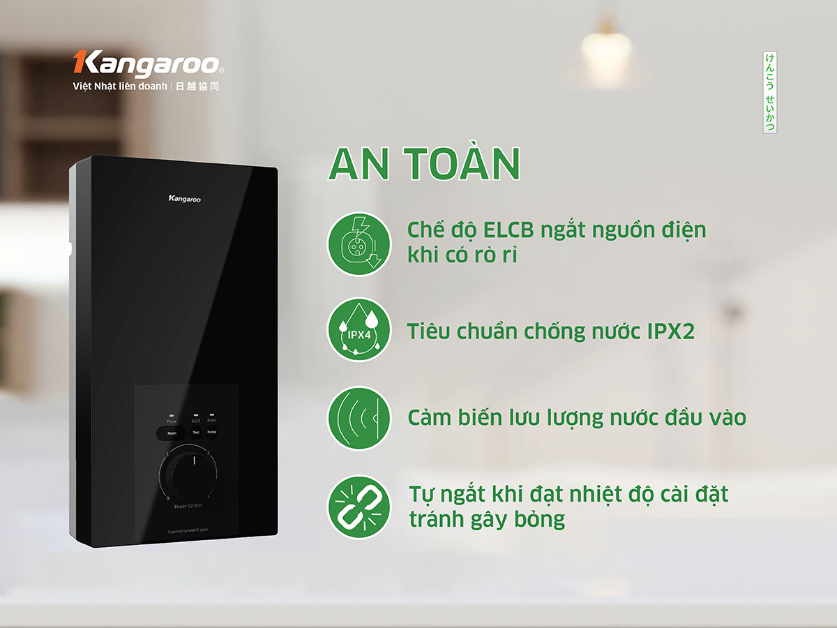 Máy nước nóng Kangaroo KGWD45P2 sử dụng hệ thống cầu dao ELCB tự động ngắt khi rò rỉ điện, cùng 2 chế độ test ELCB đảm bảo an toàn.