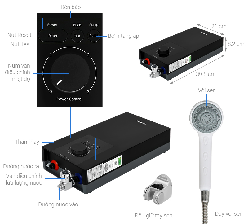 - Cơ chế làm nóng trực tiếp kèm vòi sen 2 chế độ phun.