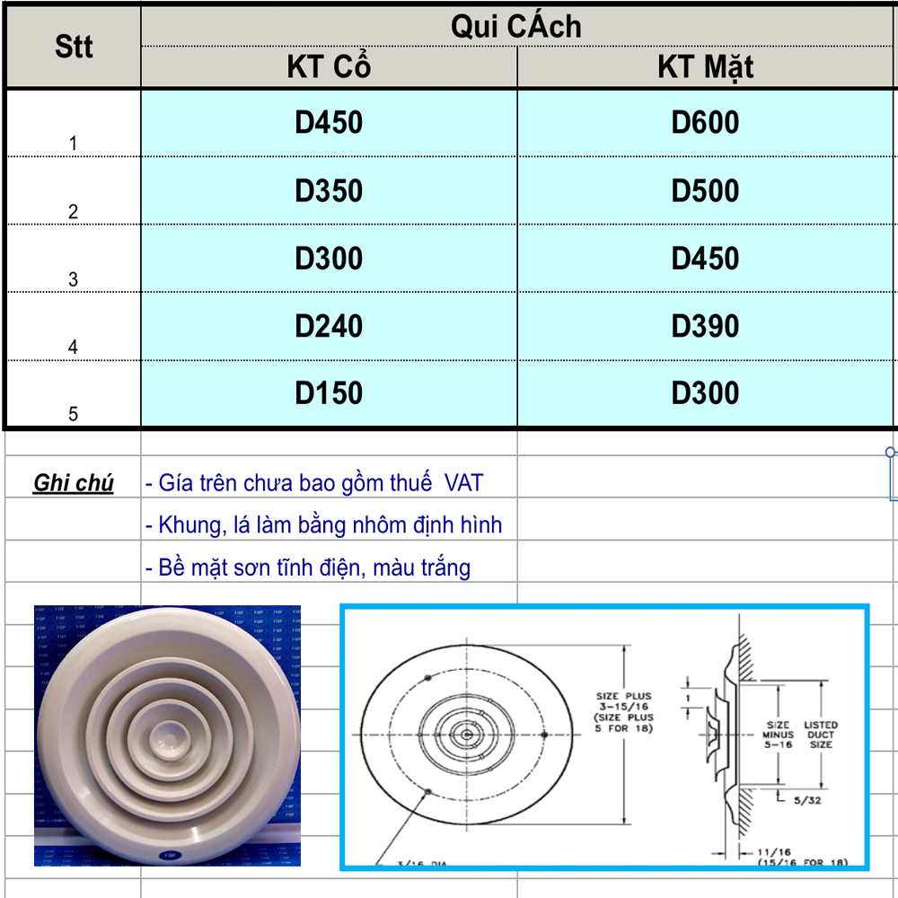 Miệng gió tròn phi ø300mm Ứng dụng và đặt điểm : Ứng dụng sử dụng miệng cấp gió Hướng gió 360º Vị trí treo từ do, lắp vào trần giả Vật liệu nhôm định hình sơn tĩnh điện Màu sắc trắng Ưu điểm đẽ lắp đặt
