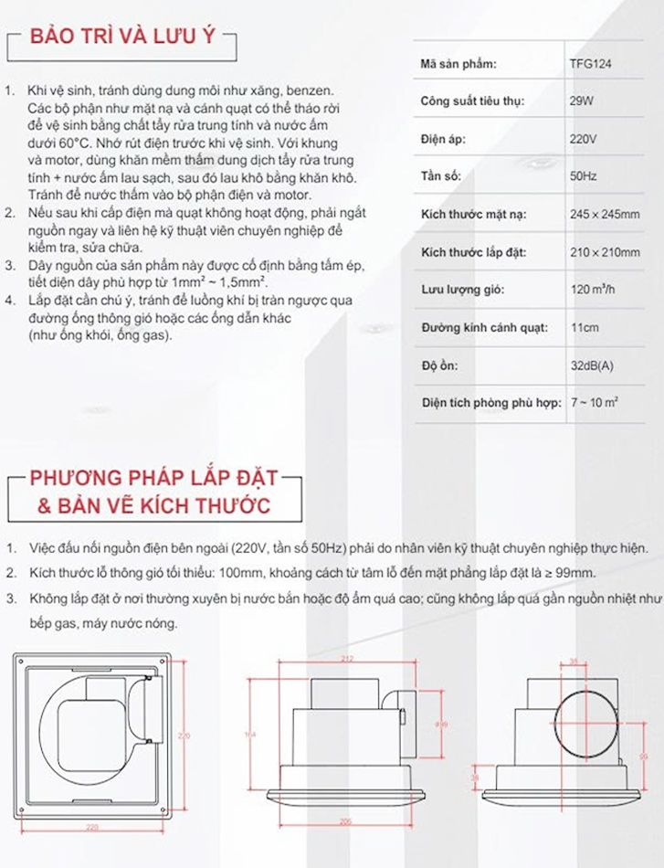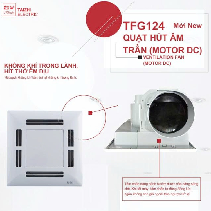 - Quạt hút âm trần Taizhi TFG-124 phù hợp cho văn phòng, phòng ngũ, nhà vên sinh,v.v...