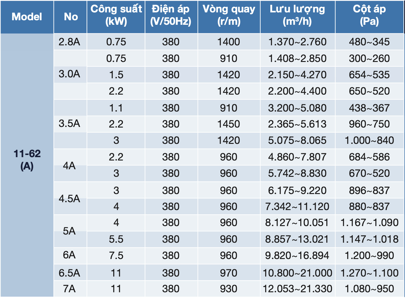 - 11-62A là dòng quạt ly tâm đặc trưng chuyển động trực tiếp, có hiệu suất cao, vòng quay thấp, cánh quạt ly tâm có tiếng ồn thấp, nó có cấu trúc cánh thiết kế tiên tiến, vỏ xoắn ốc, thiết kế tinh tế, ít rung, vận hành. Môi trường vận hành không mang chất dễ cháy nổ, không gây hại cho cho con người. Trong không khí không chứa bất kì vật liệu kết dính, bụi và hạt có nồng độ không vượt quá 150 mg/m3 và nhiệt độ không cao hơn 800C.