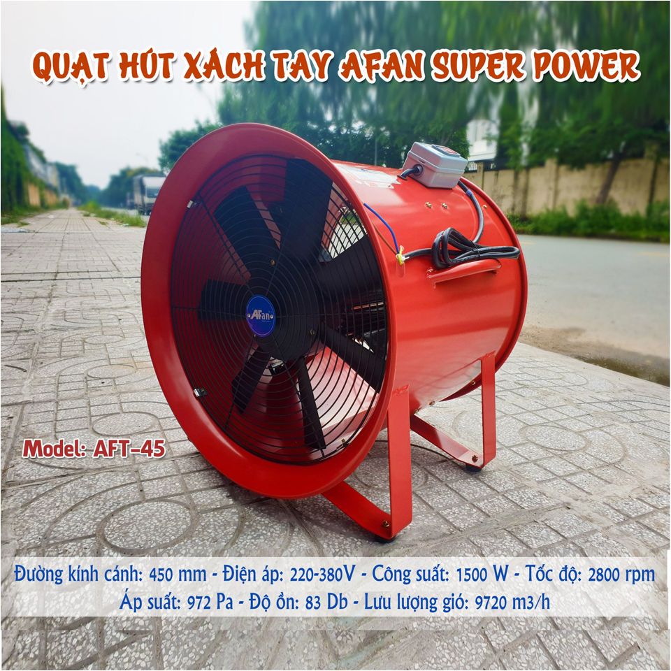 Quạt hút thổi cao áp AFan AFT-45 chuyên sử dụng để cấp gió tươi, dẫn khí vào hầm xe, hầm mỏ, hút mùi, hút bụi trong xây dựng.