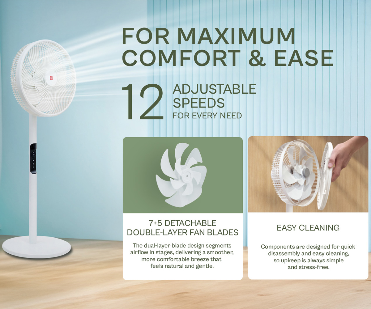 - Quạt đứng DC hai cánh hoàn toàn mới với cảm biến nhiệt độ ECO tích hợp, dễ vệ sinh, làm mát thông minh hơn, không khí sạch hơn và tiết kiệm năng lượng.