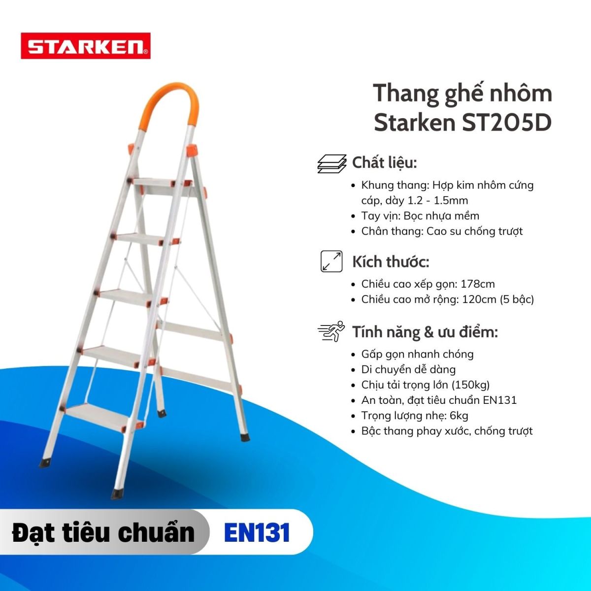 Tải trọng: 150kg, đạt tiêu chuẩn EN131.
