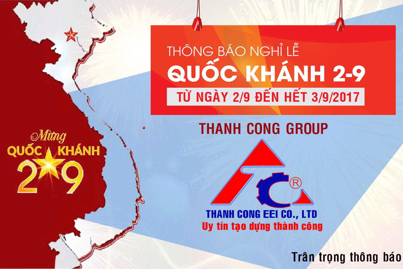 - Ngày Quốc Khánh 2/9 năm nay, vào ngày thứ 7 cuối tuần. Công ty TNHH Thiết Bị Điện Công Nghiệp Thành Công (THANH CONG GROUP) sẽ nghỉ liên tiếp 2 ngày từ 2/9 đến hết 3/9/2017. Ngày 4/9/2017 sẽ làm việc lại bình thường.