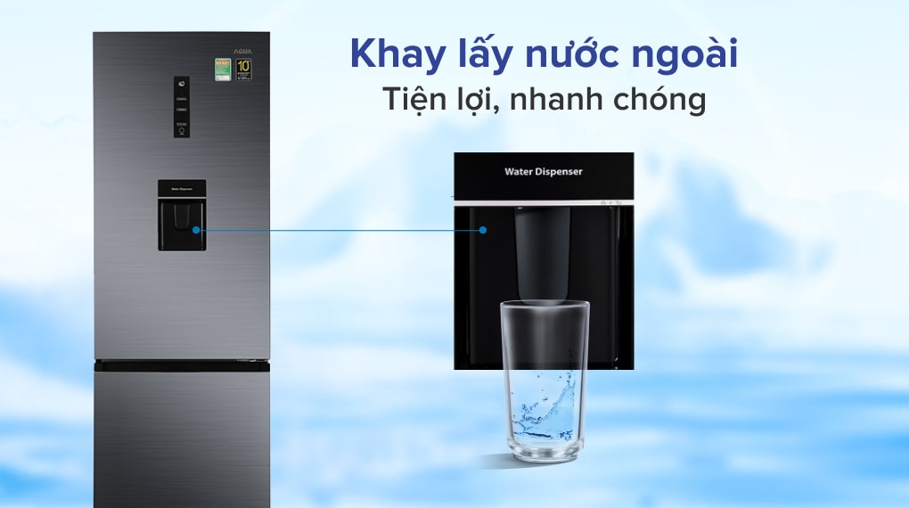 Tủ lạnh Aqua có trang bị khay lấy nước ngoài tiện lợi hơn. Bạn có thể lấy nhanh một ly nước lạnh giải khát mà không cần mở cửa tủ, góp phần hạn chế được tình trạng thất thoát hơi lạnh, tiết kiệm điện hơn.
