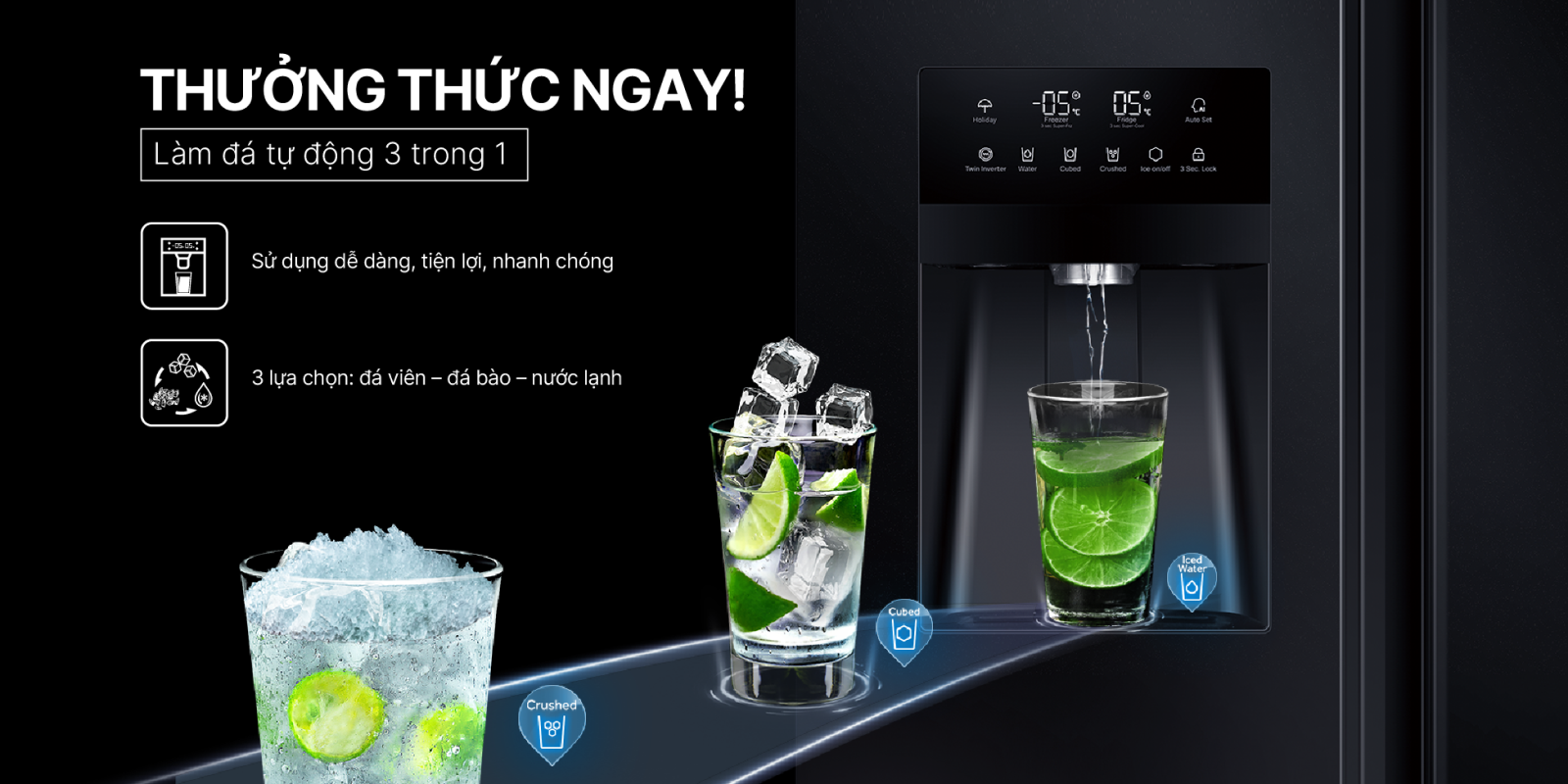 Tủ lạnh Aqua 515 lít AQR-SA541XA(BL) với chức năng làm đá tự động 3 trong 1. Với 3 lựa chọn (đá viên, đá bào, nước lạnh).