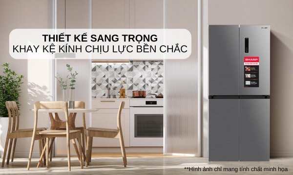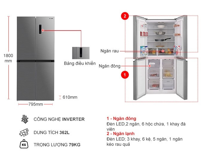 Ngăn lạnh gồm 3 kệ chia làm 4 hộc, 1 ngăn giữ ẩm rau củ, 2 bên cánh tủ có tổng cộng 4 khay chứa.